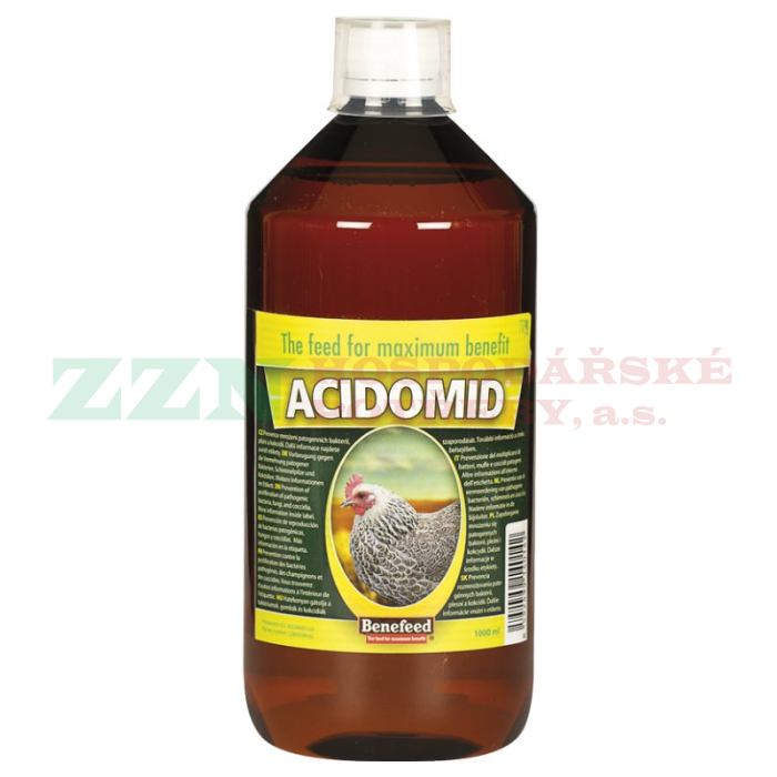 ACIDOMID® působí jako prevence množení patogenních bakterií, plísní a kokcidií. Velice dobře také tlumí rozvoj a množení nitrobuněčných parazitů jako např. kokcidií. Není však léčivo, neobsahuje ani kokcidiostatika a nezanechává tak rezidua v organismu. Nemá také ochranné lhůty.