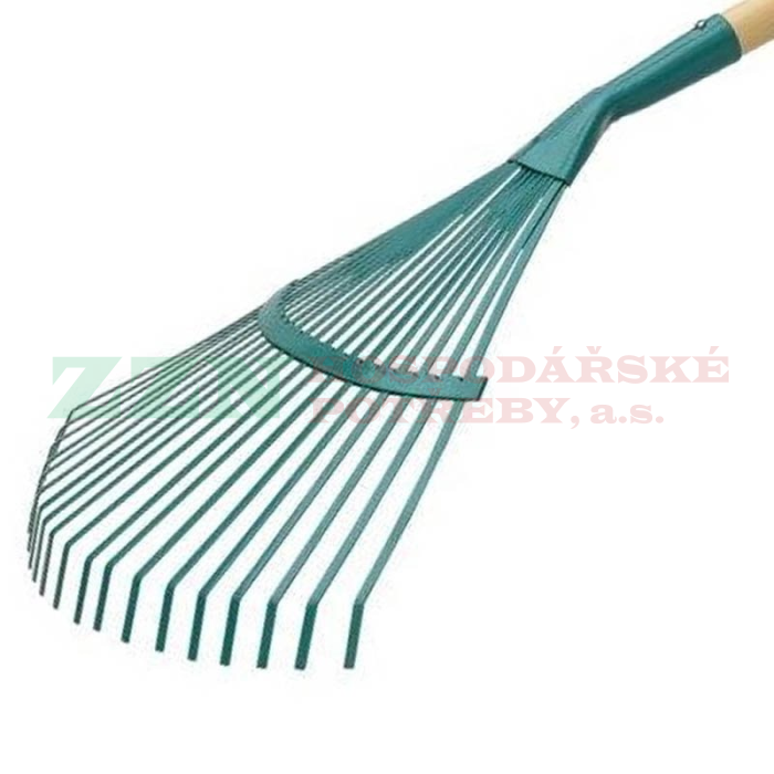 Dámské kovové hrábě na listí s dřevěnou násadou.