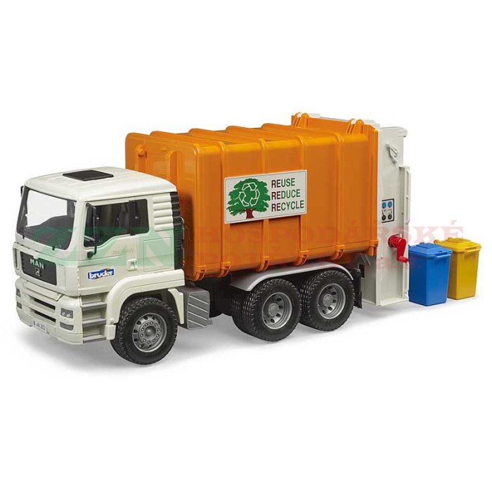 • Užijte si ještě více zábavy a doplňte tento perfektní model o sadu na odpadky BRUDER (č. položky: 02607 se 3 malými popelnicemi a jedním velkým kontejnerem).