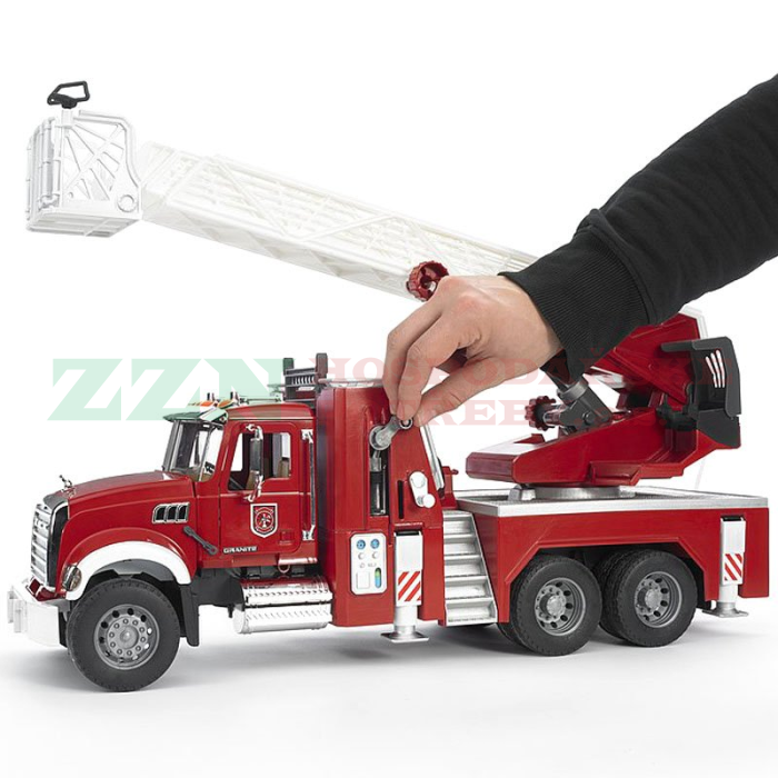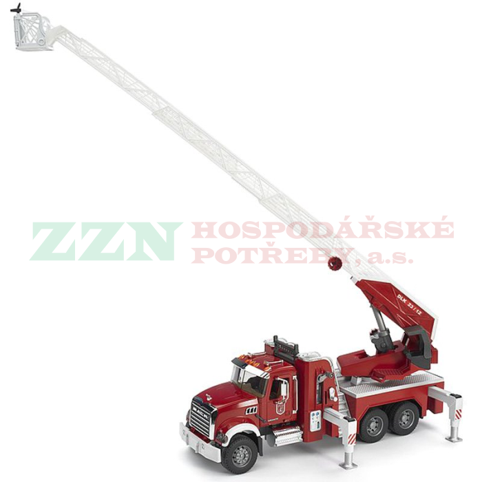 • Velké hasičské auto MACK Granite je třínápravový nákladní vůz s otočným výsuvným žebříkem a funkční stříkačkou.