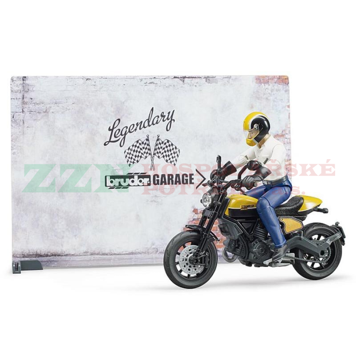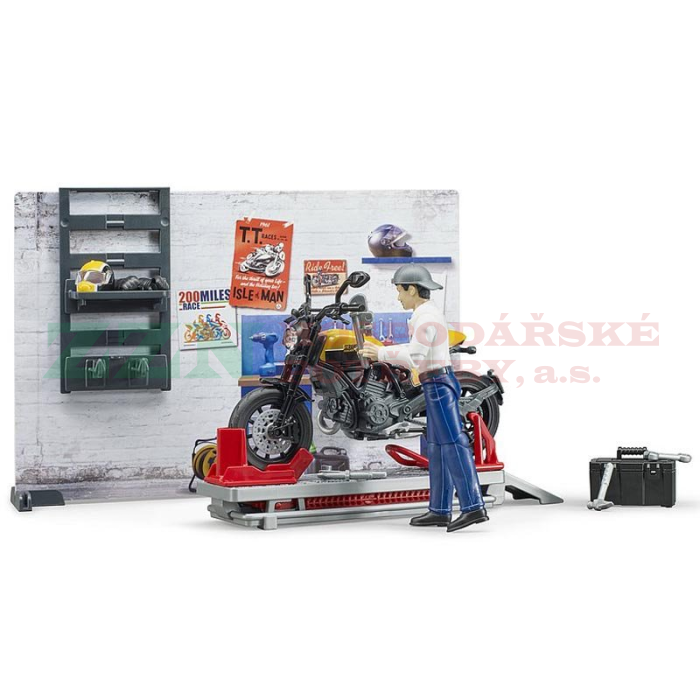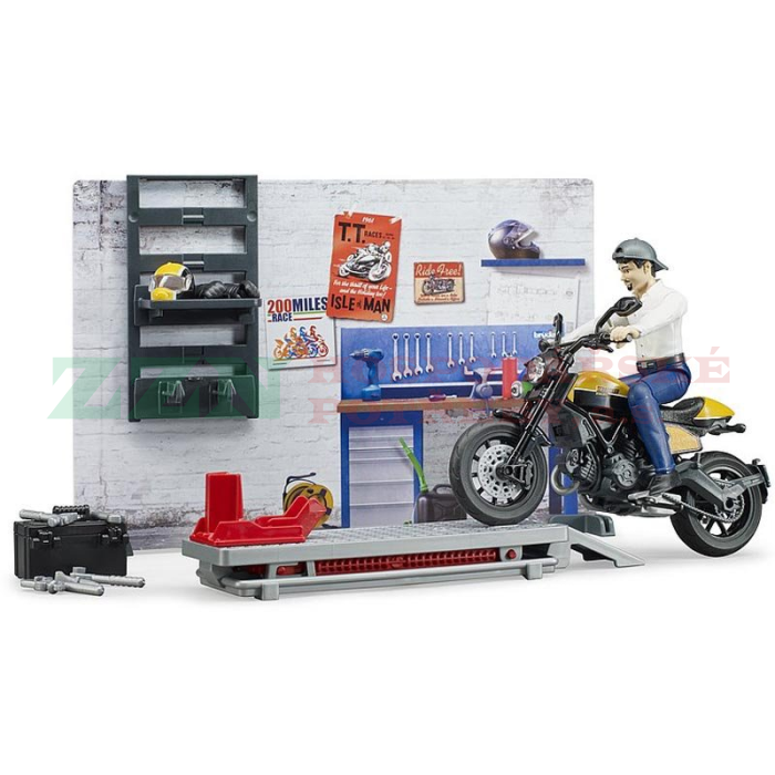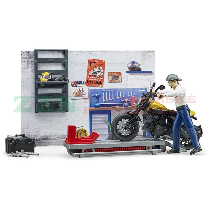 BRUDER 62102 Motodílna s figurkou mechanika a motorkou Ducati Scrambler