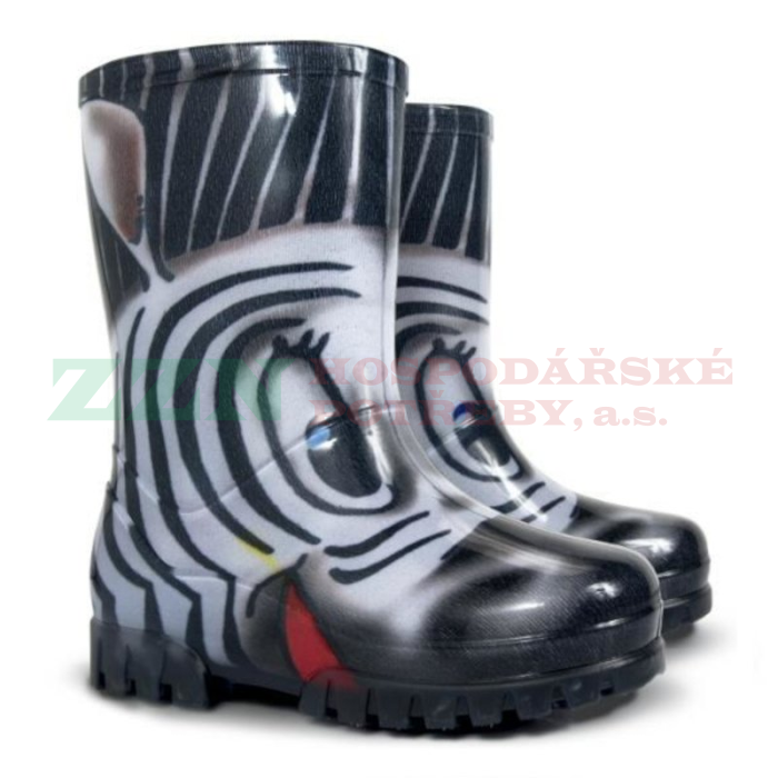 DEMAR Dětské barevné holínky ZEBRA, v černo-bílé barvě s motivem zebry, vyrobeny z kvalitního a odolného PVC.