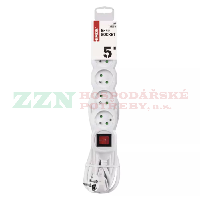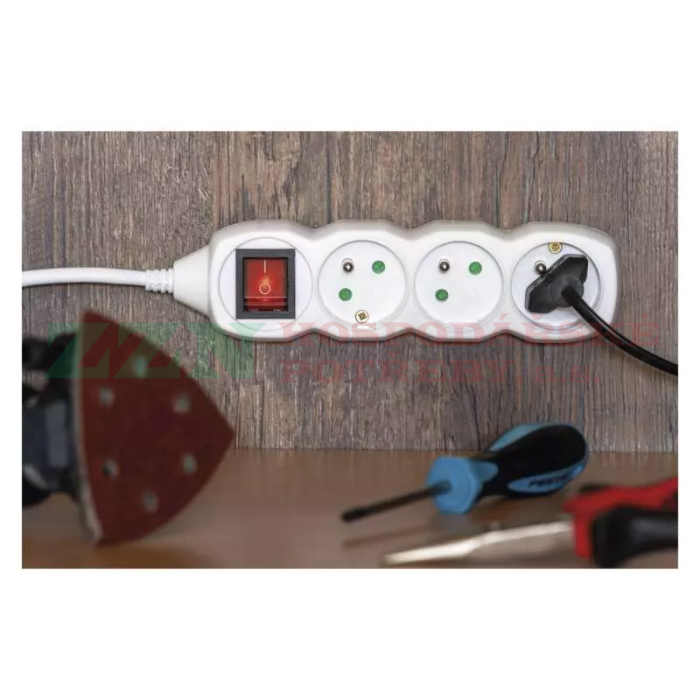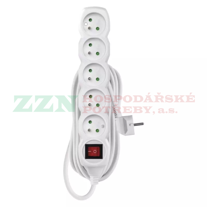 • Bílý prodlužovací přívod, 5 zásuvek s délkou 5 m a průřezem vodiče 1 mm2.