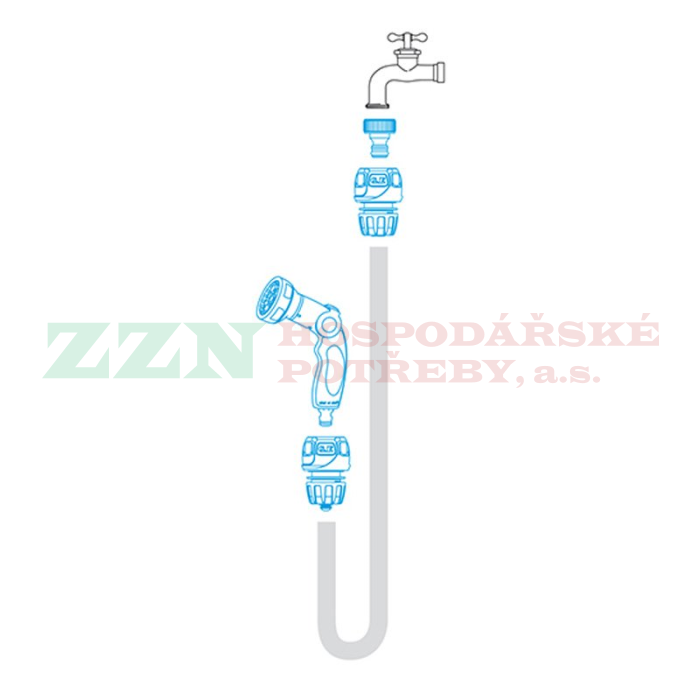 Sada pro zavlažování obsahující zavlažovací pistoli, adaptér na kohoutek a hadicové spojky.