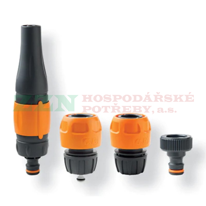 Sada pro zavlažování obsahující zahradní nastavitelnou trysku, adaptér na kohoutek a hadicové spojky.