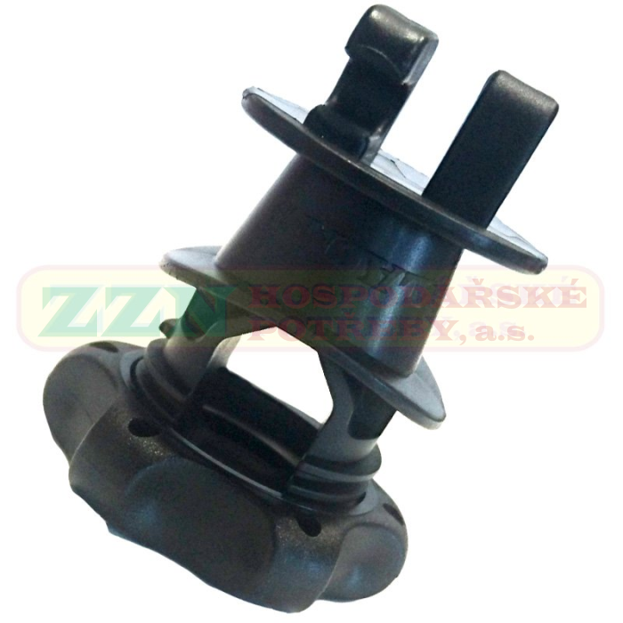 Průběžný izolátor pro vodivá lanka do O 4mm a dráty určený k nasazení na tyč do O 14mm. Izolátor se na tyčku nasune a v požadované výšce se utáhne upevňovací plastová matice. Lanko nebo drát se zasune pod protiběžné úchyty. Rozměry 58x48x48mm. Hmotnost 21g.