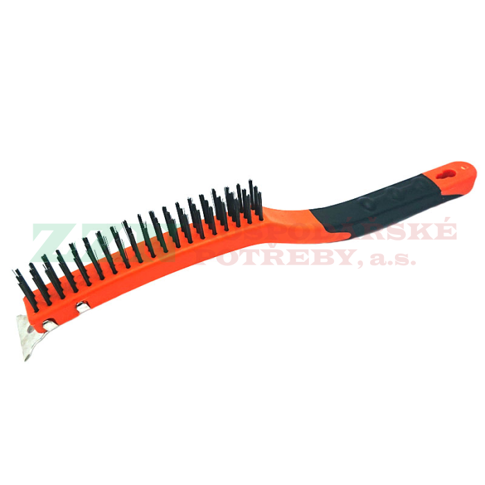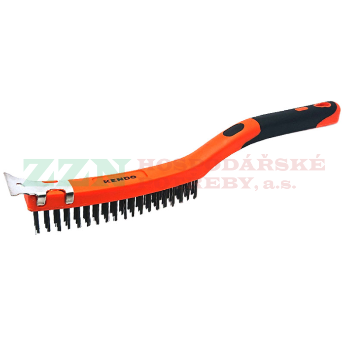 KENDO Drátěný kartáč se třemi řadami drátů, škrabkou a měkčenou ABS rukojetí pokrytou termoplastickou gumou.