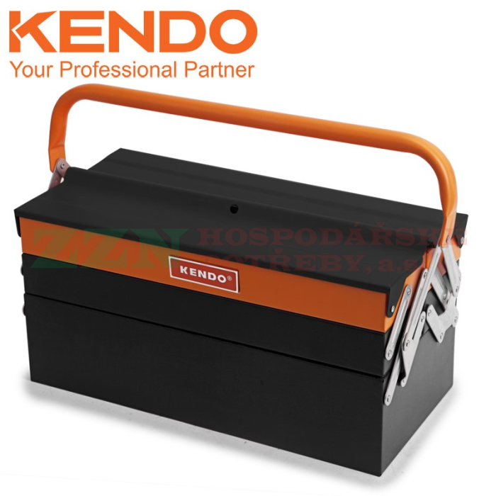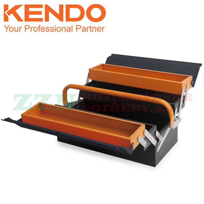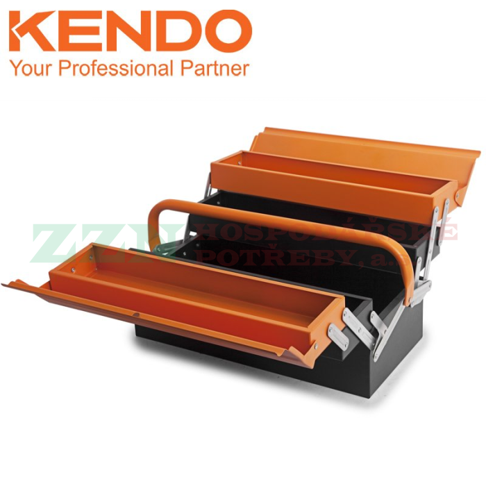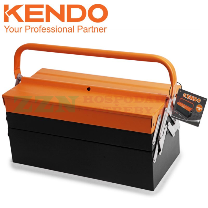 Kovový kufr na nářadí KENDO 90204 o rozměrech 46x20x20,5 cm(DxŠxV - vnější), rozkládací s 4-mi kolejemi.