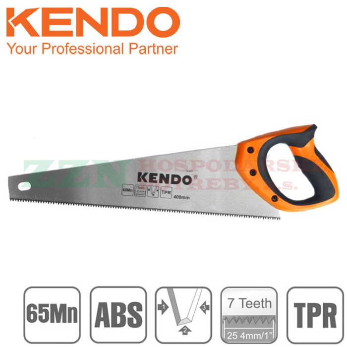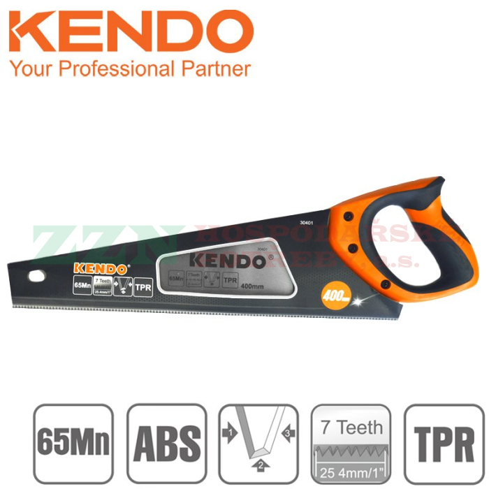 KENDO Ruční pilka ocaska pro jednoruční řezání dřeva s délkou ostří 400 mm, rukojetí z měkkého bi-materiálu v kombinaci pryže a gumy a tvrzenými kalenými zuby pro rychlé řezání.