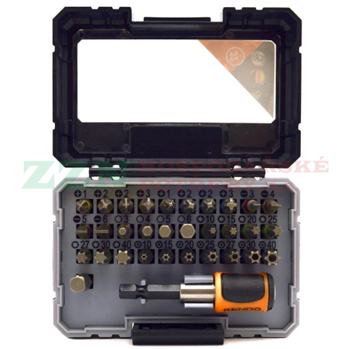 KENDO 32 dílná sada bitů s magnetickým držákem, vyrobena z kvalitní kalené oceli, která obsahuje bity typu PH, PZ, SL, HEX, T (torx), TR (torx s dirkou).