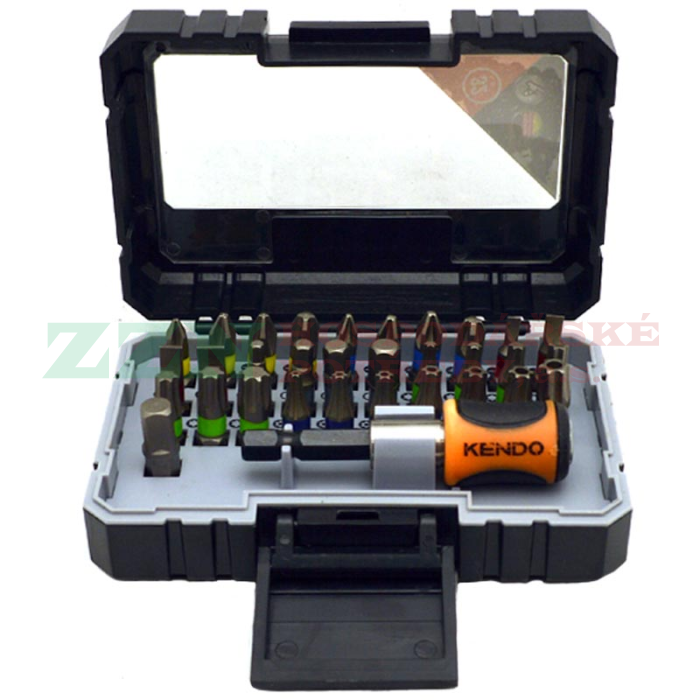 KENDO Sada bitů 32-dílná na šrouby s rovnou drážkou, drážkami PH (Phillips), PZ (Pozidriv), HEX (imbus), T (torx), TR (torx s dirkou).