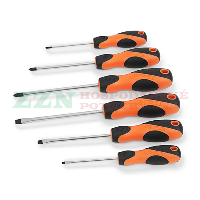 KENDO Sada šroubováků o 6 kusech - 3 ploché šroubováky 3x75 mm;5x100 mm;6x125 mm; 3 křižové šroubováky PH0x75 mm;PH1x100 mm;PH2x125 mm.