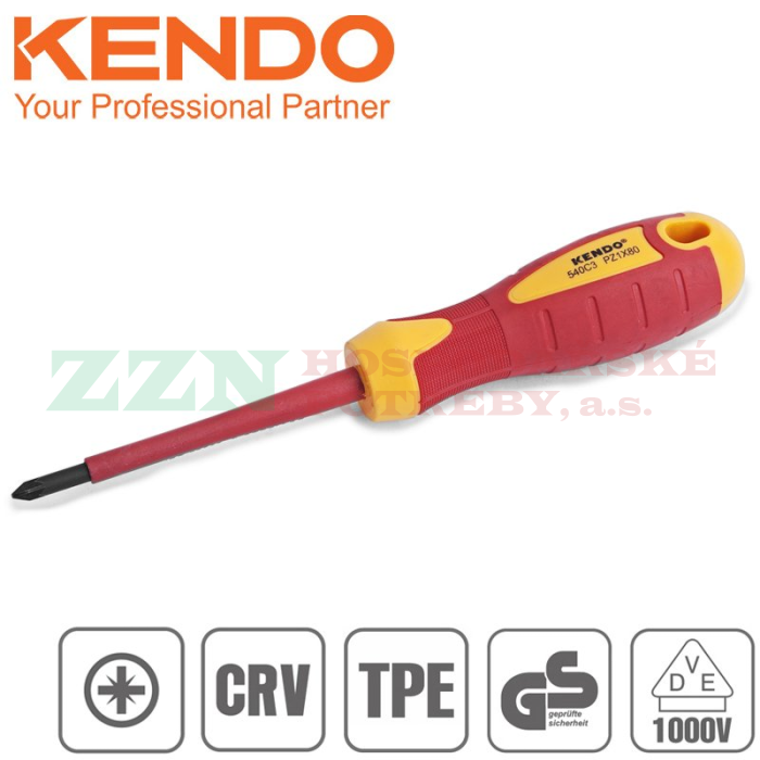 KENDO Elektrikářský křížový šroubovák s hrotem PZ, vyrobený z chrom-vanadiové oceli, magnetickým hrotem, rukojetí v kombinaci TPE/TPR pro bezpečnou práci pod proudem.