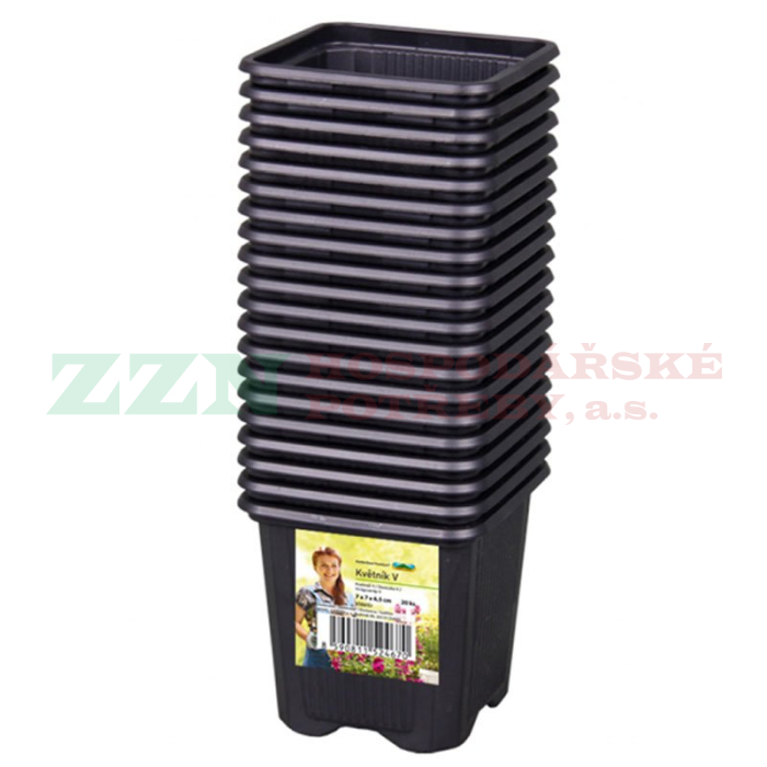 Černý plastový sadbovač s rozměrem 7x7x6,5 cm.