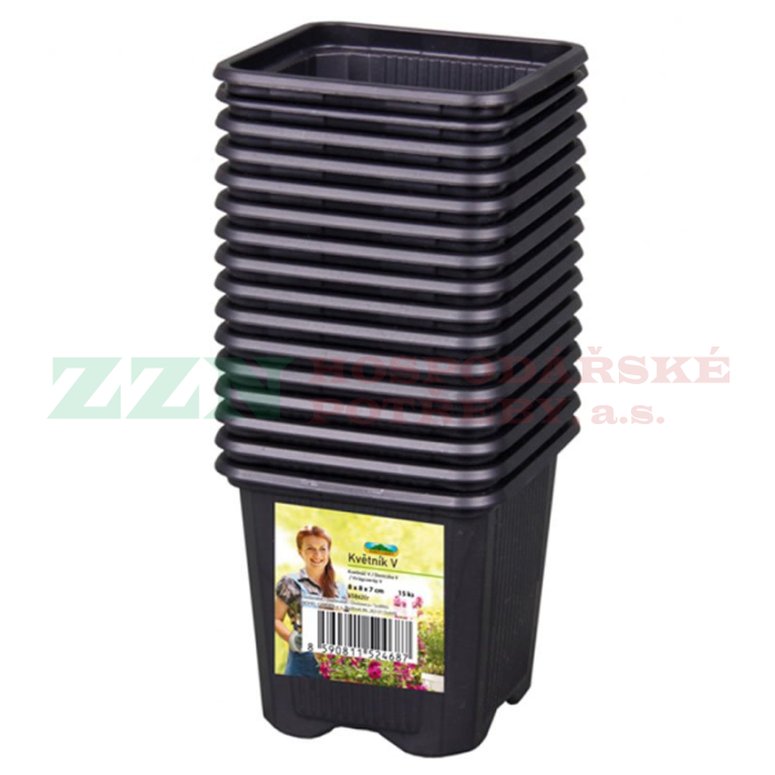 Černý plastový sadbovač s rozměrem 8x8x7 cm.