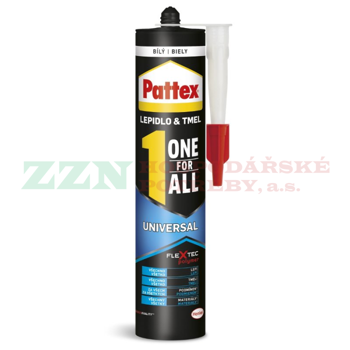 Lepidlo PATTEX One For All Universal je jednosložkové flexibilní univerzální montážní lepidlo a tmel pro interiér i exteriér s recepturou FlexTec®. Je určeno k lepení a tmelení většiny savých i nesavých materiálů, jako jsou cihla, keramika, beton, dřevovláknité a dřevotřískové desky, sádrokarton, překližka, přírodní kámen (tloušťka min. 10 mm), MDF, dřevo, kov, tvrzené PVC, polystyren, sklo, plasty, lakované povrchy, zrcadla.
