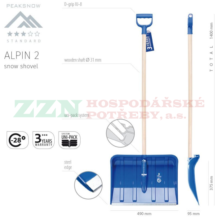 • Plastová lopata na sníh ALPIN 2 je vybavená odolnou ručkou a dřevěnou násadou o průměru 31 mm.