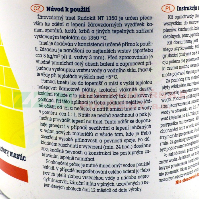 - Žáruvzdorný tmel Rudokit NT 1350 je určen především ke zdění a lepení žáruvzdorných vyzdívek kamen, sporáků, kotlů, krbů a jiných tepelných zařízení vystaveným teplotám do 1350°C.
