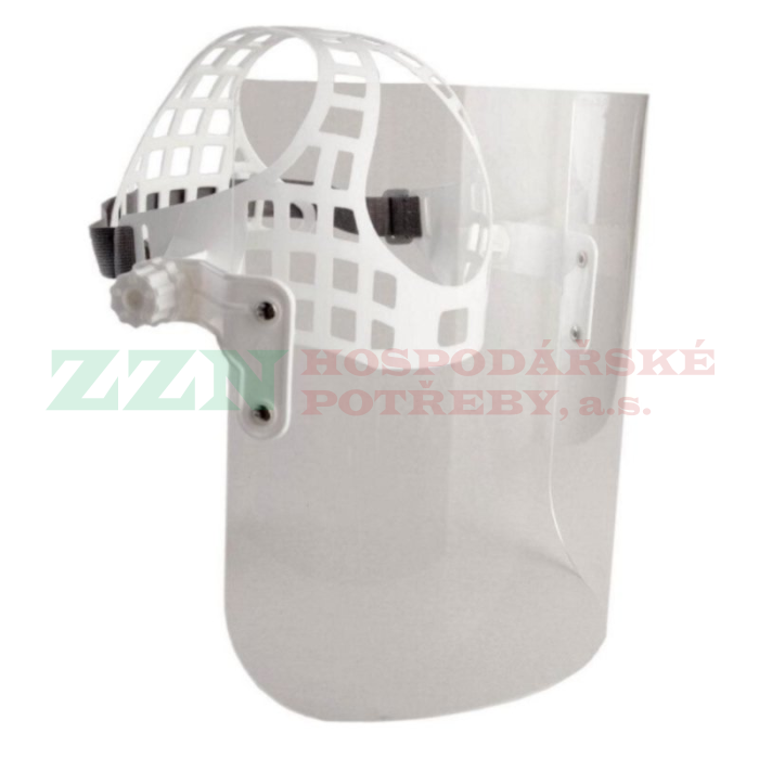 Ochranný štít s hledím z polymetylmetakrylátu s náhlavním nosičem.