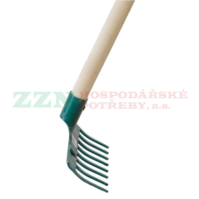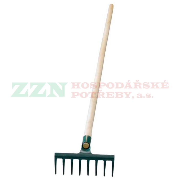 Kovové hrábě s 8 zuby a dřevěnou násadou.