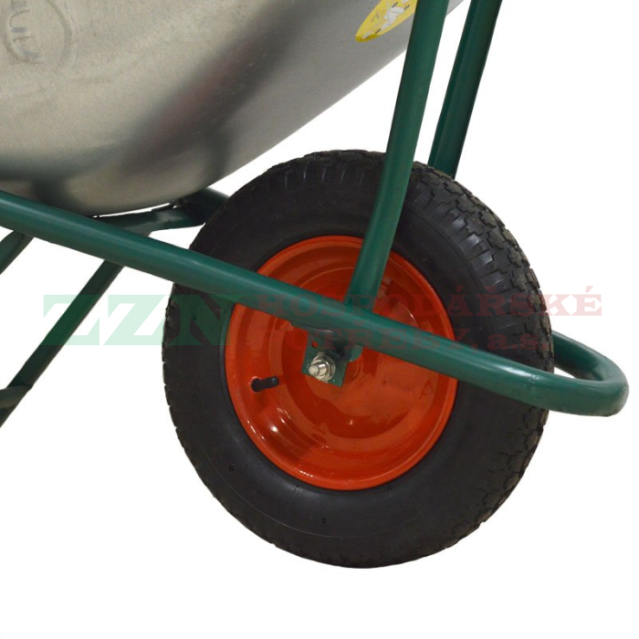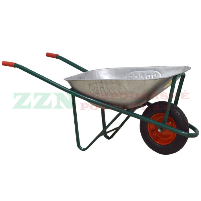Stavební kolečko s pozinkovanou hlubokou korbou o objemu 75 l.